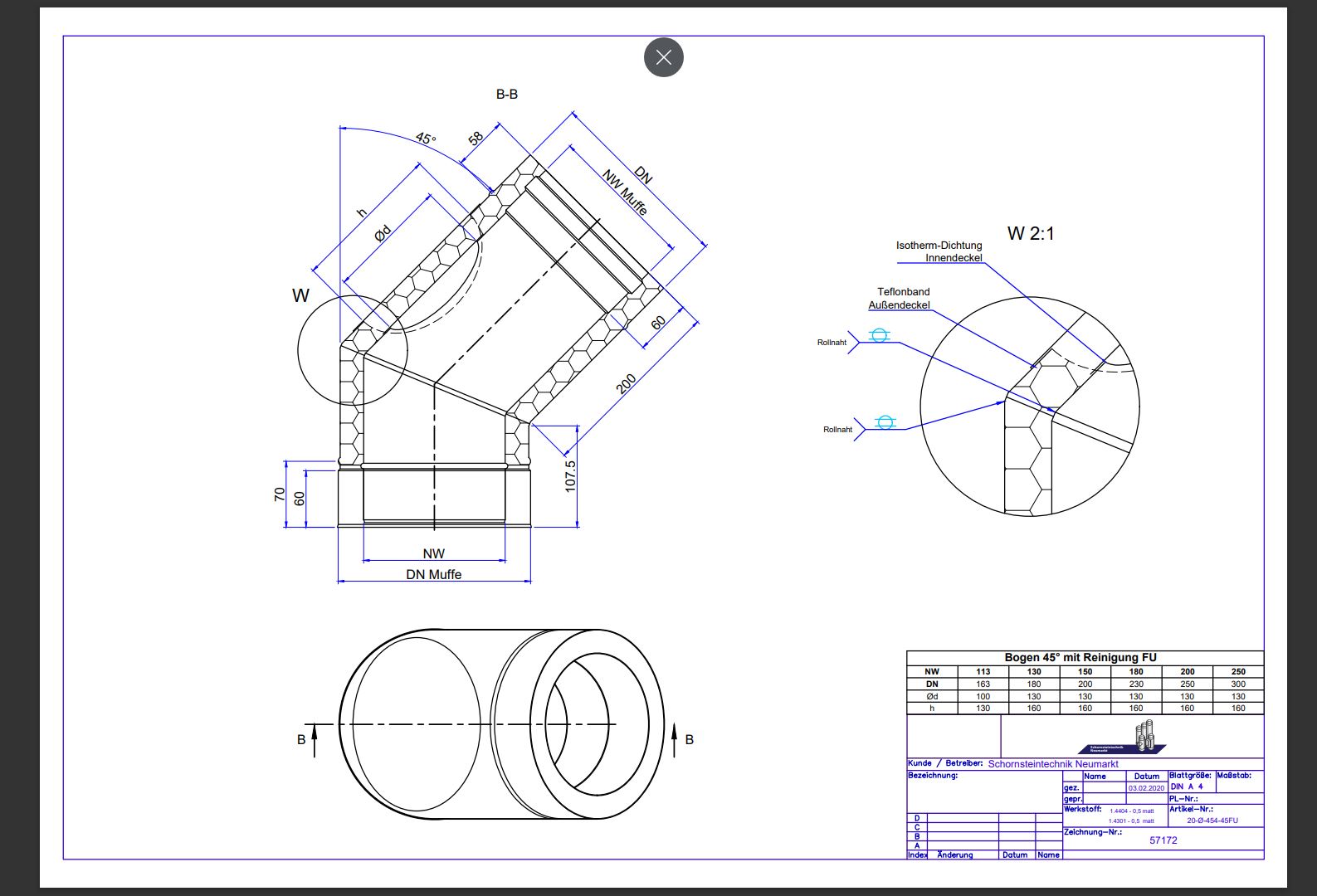 Technische Zeichnung Bogen 45° mit Reinigung FU