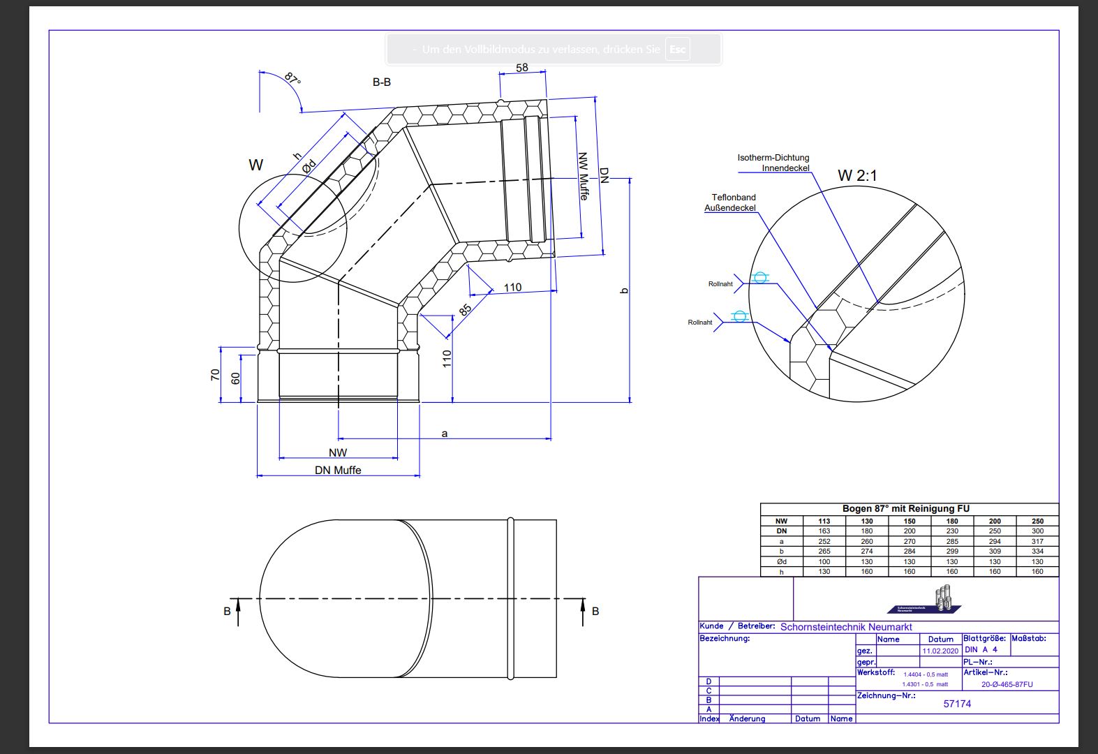Technische Zeichnung Bogen 87° mit Reinigung für Öl- und Gasbetrieb