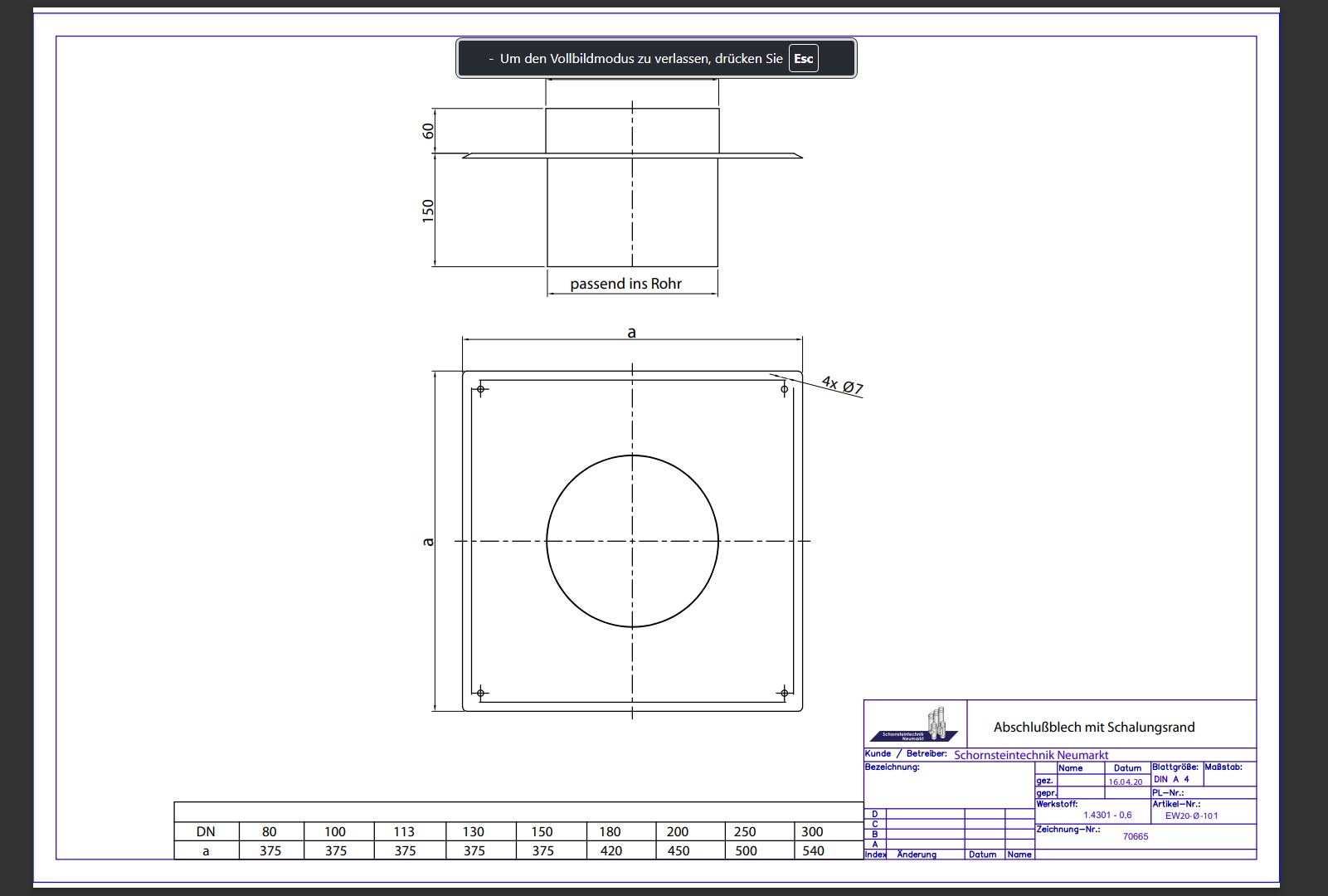 Technische Zeichnung Abschlussblech