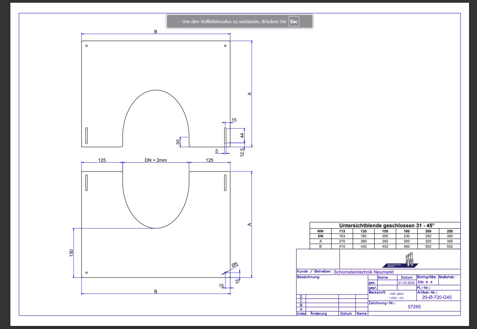 Technische Zeichnung Untersichtblende geschlossen für 31°-45° Neigung 2-teilig