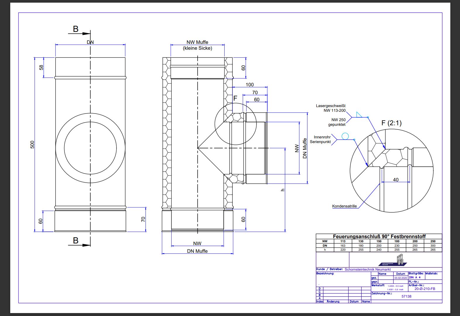 Technische Zeichnung Feuerungsanschluss 90° für Festbrennstoff